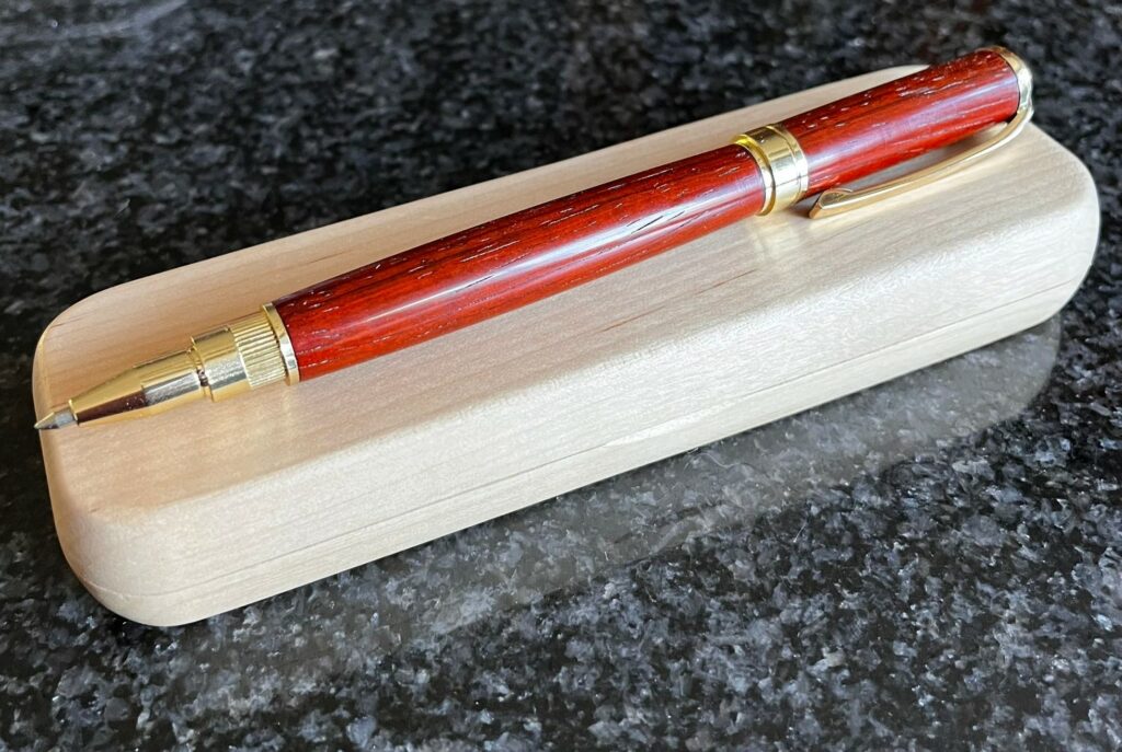 We hebben een ontzettend leuke dag gehad, waarin de dames de kunst afkeken en moeder later een pen heeft gemaakt. De bovenste pen is afgewerkt met de nieuwe penkit in het bordeaux rood en de onderste in goud. Ik vind dat de bordeaux rode penkit prachtig past bij het Taxus hout. De pen krijgt hierdoor een hele warme uitstraling.