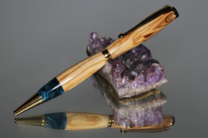 Na enig wikken en wegen is uiteindelijk voor de combinatie olijfhout met turquoise acryl gekozen. Het is een heel subtiel klein stukje acryl maar combineert wel erg mooi met het hout. Voordeel hiervan is ook dat het hout langer mooi zal blijven want het gedeelte dat je vasthoud met schrijven is het acryl.