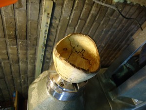 Een voordeel van de nieuwe draaibank is dat ik nu ook meer kan experimenteren met het draaien van grotere dingen. Dus het was weer eens tijd voor een nieuwe schaal van tulpenhout. Een iets ander model van de vorige.