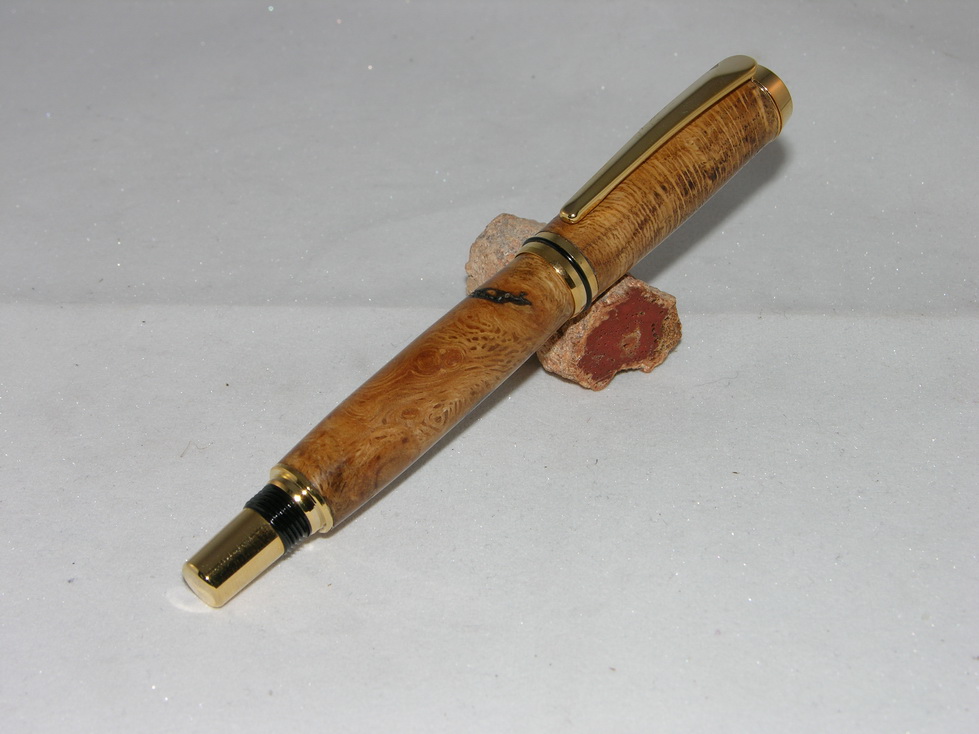 Materialen: Eiken warrelknoest, gestabiliseerd hout, Baron vulpen goud.