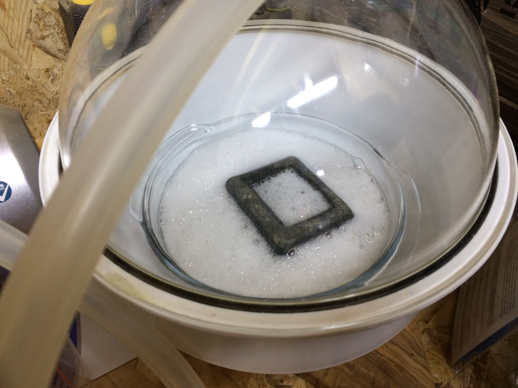 Het hout gaat in een vacuümruimte. Door het vacuüm wordt de lucht uit het hout gezogen. Op het moment dat het vacuüm eraf gaat, zuigt het hout zich weer vol met de kunsthars.