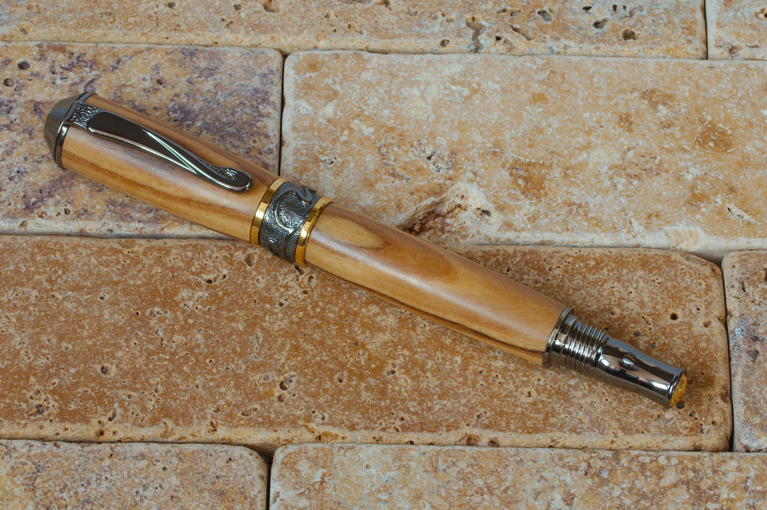 Deze Fancy pen is gemaakt van Olijfhout en is afgewerkt met goud.