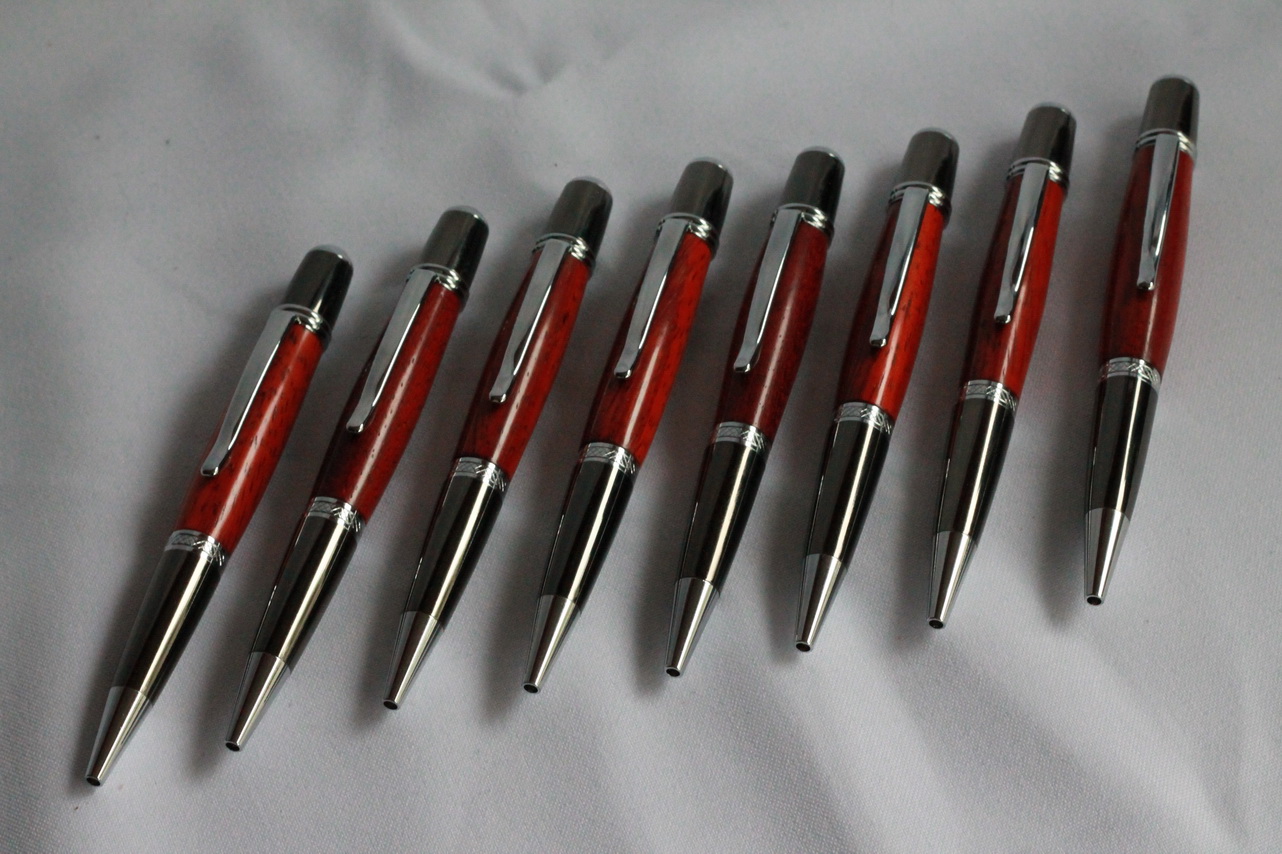 Het was wel even zoeken naar de juiste houtsoort aangezien ze in pennendoosjes zouden komen van een rode houtsoort. Uiteindelijk hebben na overleg gekozen voor Mura Puranga, omdat die het beste bij het doosjes paste.