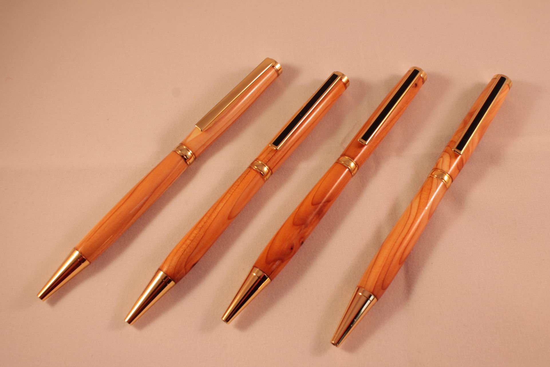 Ik ga dit jaar gelijk goed van start met 4 pennen gemaakt van Taxushout met goud. Je ziet dat ondanks dat het hetzelfde stuk hout is, toch de tekening allemaal weer anders is. Ook sommige stukken zijn donkerder van kleur. Het is blijft ook één van mijn favoriete houtsoorten om mee te werken.