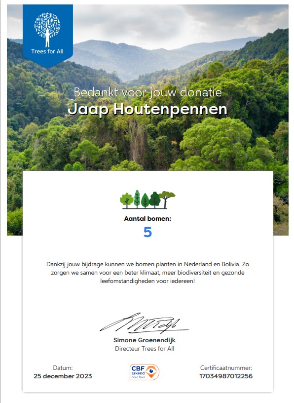 Eind december hebben we nog een donatie gedaan voor een aantal bomen. Lezend op de website van Trees For All, hebben ze in hun bestaan van 25 jaar al 10,5 miljoen bomen geplant in binnen en buitenland. Een fantastisch resultaat waar ik graag aan meewerk.