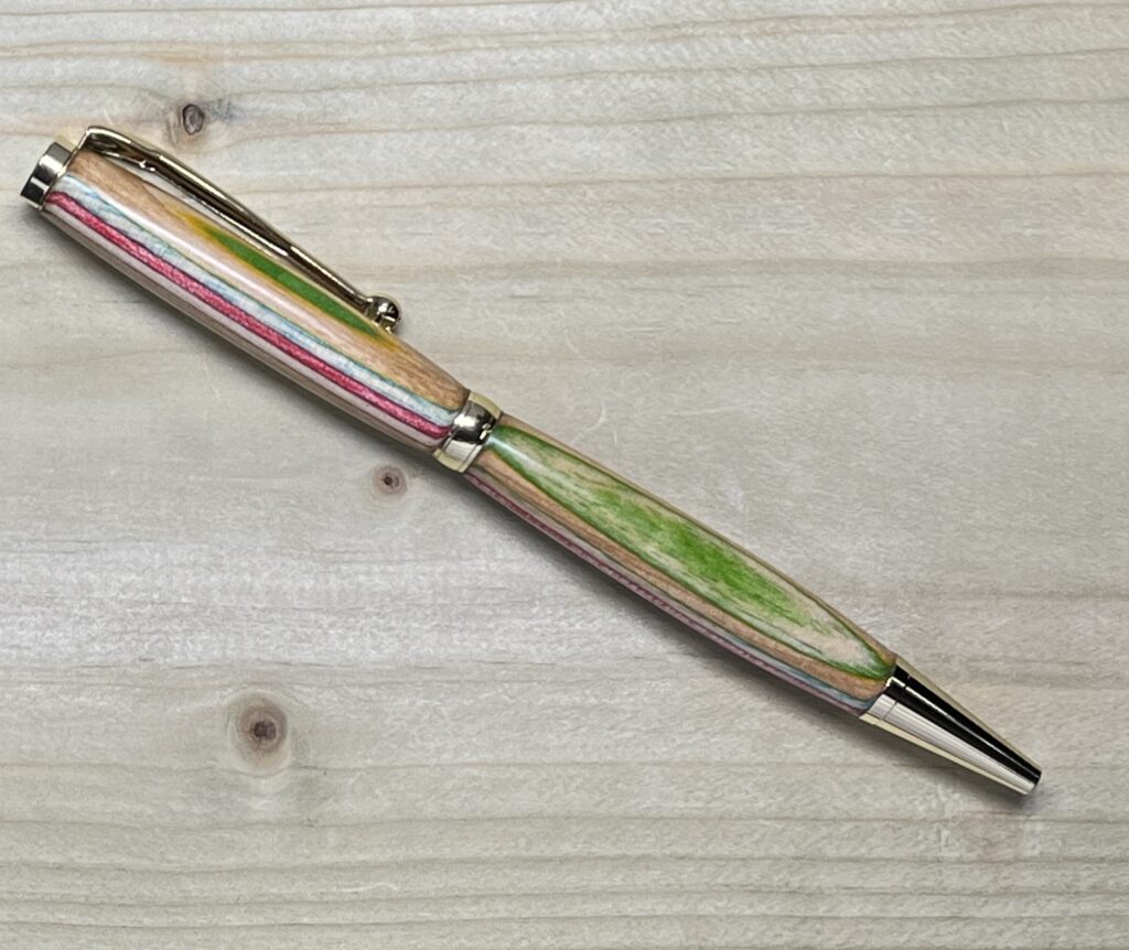 Ik heb eerst allerlei gekleurde stokjes op elkaar gelijmd en na het uitharden ben ik er een pen van gaan maken.