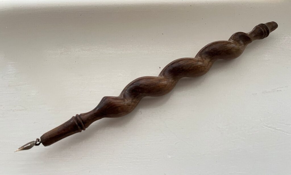 Enige tijd geleden heb ik wat onderdelen gekregen van hele oude eiken stoelen. Dat zijn wel allemaal gedraaide onderdelen, maar er zit toch genoeg aan waar ik een pen uit kan halen.