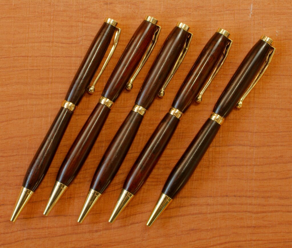 Je ziet bij deze 5 pennen ook goed het kleurverschil van het hout, terwijl ze toch van hetzelfde stuk afkomen. En zo afgewerkt met het goud, is het een hele chique pen geworden.